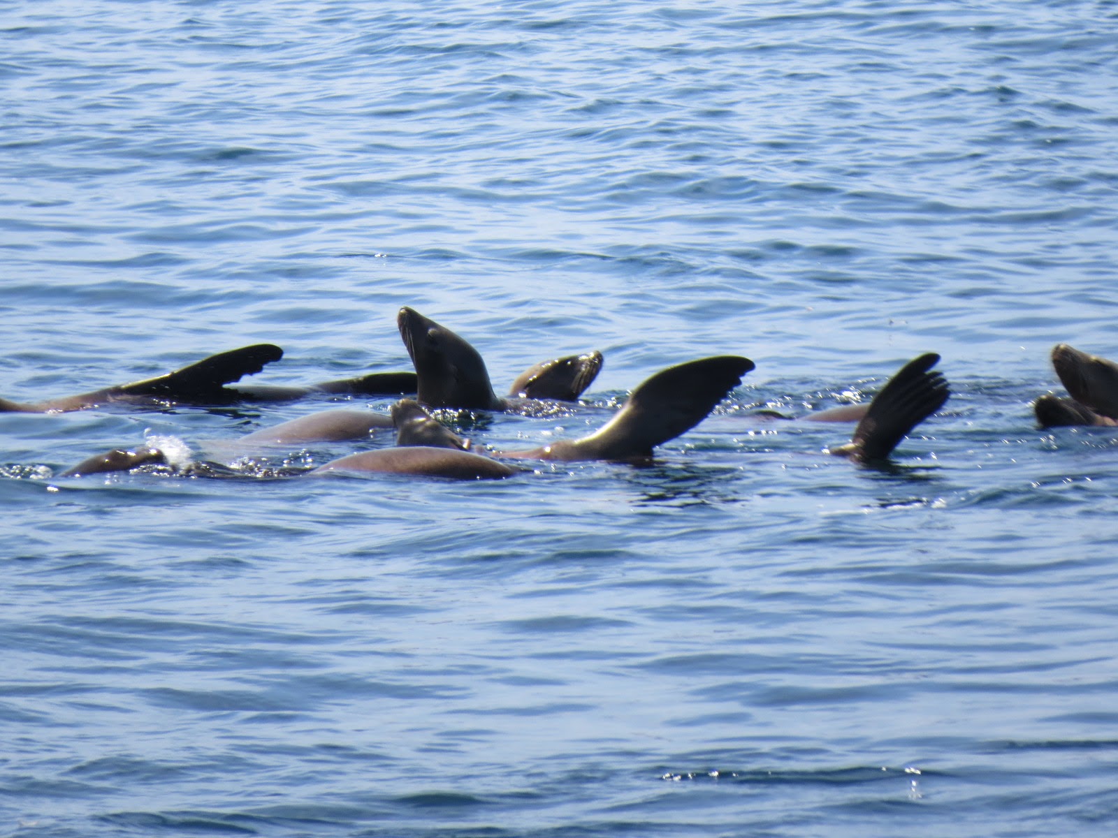 We watched a magical dance I had not heard of before. Apparently it is not unusual when food is plentiful for the whales and sea lions to share the feast. In a synchronized dance the seal lions would bubble to the surface in a concise circle. They looked like a bubbling cauldron of bouncing brown heads and tails. Within a minute of this the whales would come. They would rise slowly around the circle of sea lions and blow their spouts. Great geysers of water would fly into the air. After some casual swimming around the whales would make one last arch, flip the tail and dive down. Within seconds of the whale dive the sea lions would follow and suddenly, the water was still again, as if nothing had happened. We watched this dance several times, running about every 5 minutes